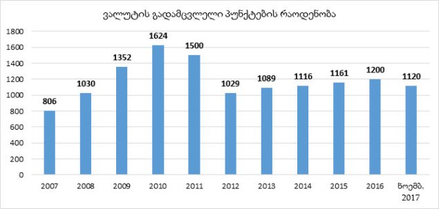 ვალუტის გადამცვლელი პუნქტების რაოდენობა 2005 წელთან შედარებით გაორმაგებულია, თუმცა, მაქსიმუმს 1 624-ს 2010 წელს აღწევდა. 2010-დან 2012 წლამდე კლების ტენდენცია ჰქონდა, 2013 წლიდან 2016 წლამდე კი გადამცვლელი პუნქტების რაოდენობა მატულობდა.