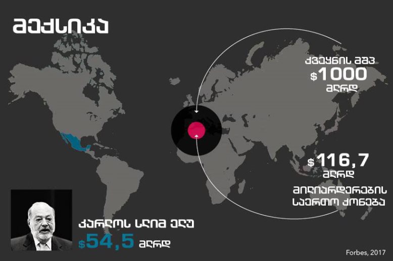 Forbes-ის ვერსიით, 2017 წელს მსოფლიოში 2043 მილიარდერი ცხოვრობს, ერთი წლის წინ კი მათი რიცხვი 1810 იყო. მილიარდერების ქონება ბოლო ერთ წელში 7,7 ტრილიონ დოლარამდე გაიზარდა. მსოფლიოში ყველაზე მეტი მილიარდერი ამერიკის შეერთებულ შტატებში ცხოვრობს, სადაც გასულ წელს მილიარდერთა რაოდენობაც და მათი ქონებაც გაიზარდა.