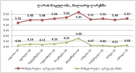 2014 წლის დეკემბერთან შედარებით აპრილის ბოლოს ბანკებს გარეთ არსებული ნაღდი ფული (M1) 8.5%-ით, 381 მლნ ლარით შემცირდა, ხოლო ე.წ. ფაქრთო ფული (M2), რომელიც ბანკებს გარეთ არსებულ ნაღდ ფულთან ერთად ლარში განხორციელებულ საბანკო დეპოზიტებსაც მოიცავს, 5.8%-ით, 345 მლნ ლარით შემცირდა.