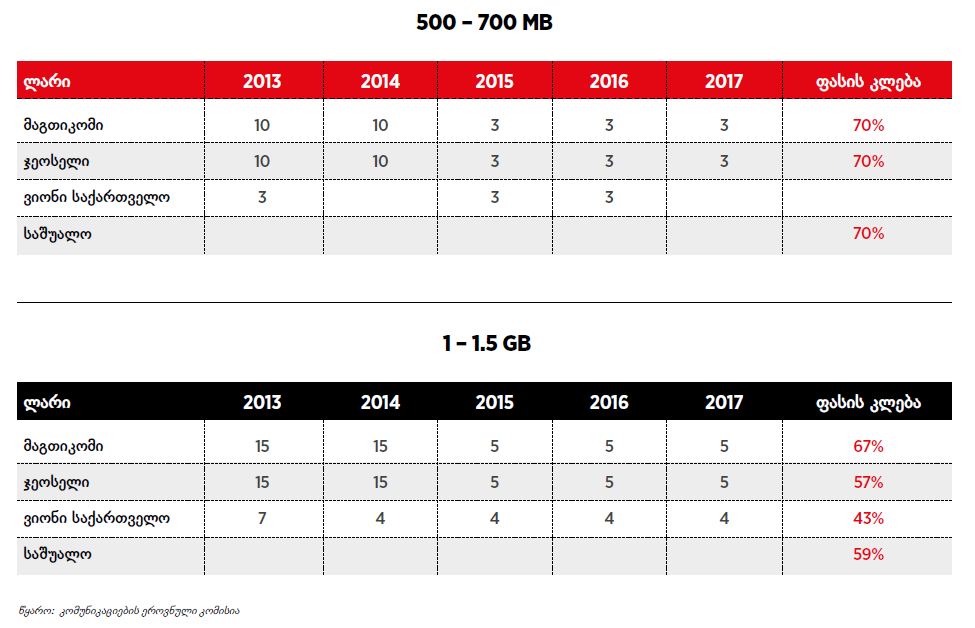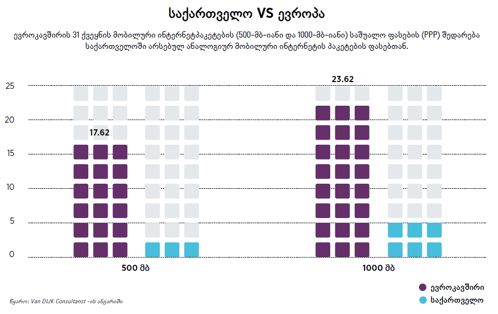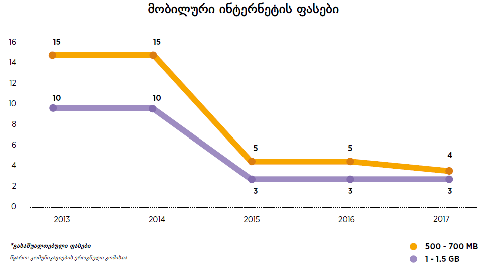 2018 წლის მხოლოდ ივნისის მონაცემებით, ინტერნეტმომსახურებით მობილური აბონენტების 47.6 %-მა, ანუ 2,327,576 აბონენტმა ისარგებლა (აბონენტების რაოდენობა ითვლება SIM ბარათით, რომლითაც საანგარიშო პერიოდში ერთხელ მაინც განხორციელდა რაიმე სახის აქტივობა). აღსანიშნავია, რომ მობილური ინტერნეტის ფასით, საქართველო ევროკავშირის ქვეყნებს შორის ბოლო ადგილზეა.
