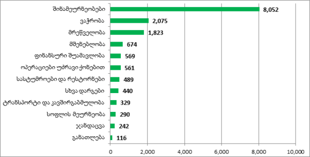 1 ივლისის მდგომარეობით, საქართველოს კომერციული ბანკების მიერ ეროვნულ ეკონომიკაზე (რეზიდენტ იურიდიულ და ფიზიკურ პირებზე) ეროვნული და უცხოური ვალუტით გაცემული სესხების ჯამური მოცულობა 15.66 მილიარდი ლარია. ყველაზე მეტი სესხი 8 მილიარდი ლარი გაცემულია შინამეურნეობებზე, საიდანაც 2.4 მილიარდი ლარი სამომხმარებლო სესხია, ხოლო 4.3 მილიარდი კი უძრავი ქონებით უზრუნველყოფილი სესხია. ეკონომიკის სექტორებიდან, ყველაზე მეტი სესხი, დაახლოებით 2 მილიარდი ლარი, ვაჭრობის სექტორზეა გაცემული. შემდეგ მოდის მრეწველობა 1.8 მილიარდი ლარით. მესამეა მშენებლობა 674 მილიონი ლარის სესხით.
