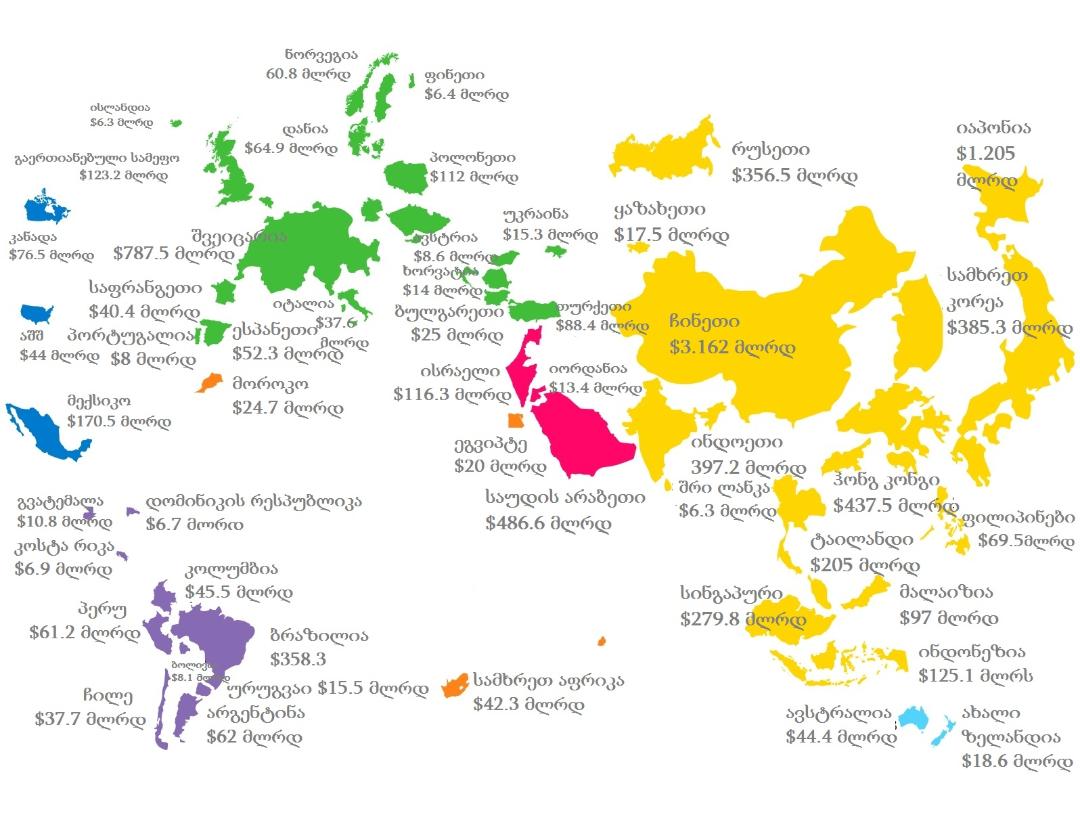 ყველაზე მეტი უცხოური ვალუტის რეზერვის მქონე ქვეყნების პირველ ათეულში მხოლოდ ერთი მოხვდა ევროპიდან – შვეიცარია – 785 მლრდ დოლარით.