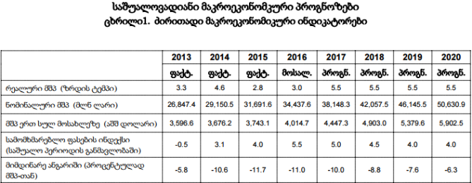 საქართველოს ფინანსთა სამინისტრომ 2017-2020 წლების ძირითადი მონაცემების და მიმართულებების დოკუმენტი გამოაქვეყნა, რომლის მიხედვით ირკვევა, რომ 2017 წელს საქართველოს მთავრობა 5.5%-იანი ეკონომიკურ ზრდას პროგნოზირებს. 5.5%-იანი ზრდა ნარჩუნდება 2018, 2019 და 2020 წლებშიც. 2017 წელს ერთ მოსახლეზე შემოსავალი 4 447 დოლარამდე უნდა გაიზარდოს. 2016 წლის ეკონომიკური ზრდა 3%-ის ფარგლებშია მოსალოდნელი, თუმცა უკვე ცნობილია მიმდინარე წლის 7 თვის ეკონომიკური ზრდა, რომელიც 2.7%-ია.
