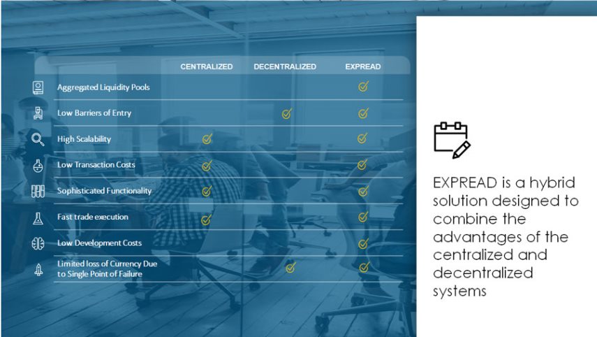 EXPREAD introduces a new paradigm of operating crypto currency exchanges and is meant to liberate the space while eliminating the high barriers of entry. It will enable the exchanges to spread throughout the world, including in the locations, where previously both centralized and decentralized models were not feasible option due to the lack of liquidity pool, security protocols and backend Blockchain architects. With its innovative model it challenges the conventional practices in the market. The combination of shared economy model with the new governance mechanisms, collective control of liquidity pools, backward auditability and cross-settlement of book orders enlarges the potential magnitude of trading on the platform.
