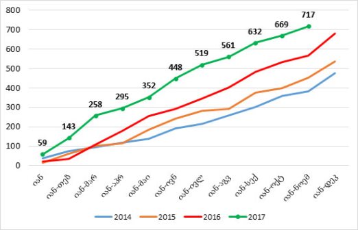 იანვარ-ნოემბერში, ჯამში, კომერციული ბანკების წმინდა მოგება 717 მლნ ლარია, რაც 150 მლნ ლარით (26.5%-ით) მეტია 2016 წლის იანვარ-ნოემბერში მიღებულ მოგებაზე.