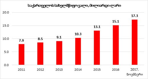 მიმდინარე წლის ნოემბერში საქართველოს სახელმწიფო ვალის მოცულობა 871 მლნ ლარით გაიზარდა და 17.3 მილიარდი ლარი შეადგინა. ნოემბერში გაიზარდა როგორც საგარეო სახელმწიფო ვალი, ასევე საშინაო სახელმწიფო ვალი. დოლარში გამოსახული საგარეო სახელმწიფო ვალი 61 მლნ დოლარით, ხოლო ლარში გამოსახული საგარეო ვალი 844 მლნ ლარით გაიზარდა (თავის წვლილი შეიტანა ლარის გაუფასურებამ). ნოემბერში საშინაო სახელმწიფო ვალი 27 მლნ ლარით გაიზარდა.