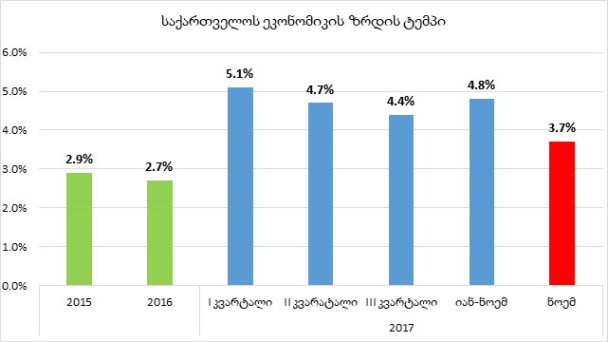 საქართველოს სტატისტიკის ეროვნული სამსახურის წინასწარი შეფასებით, მიმდინარე წლის ნოემბერში, წინა წლის ნოემბერთან შედარებით, საქართველოს ეკონომიკა 3.7%-ით გაიზარდა. 2017 წლის მე-3 კვარტალში ზრდამ 4.4% შეადგინა, ხოლო პირველი 11 თვის (იანვარ-ნოემბრის) ეკონომიკური ზრდა 4.8%-ია.