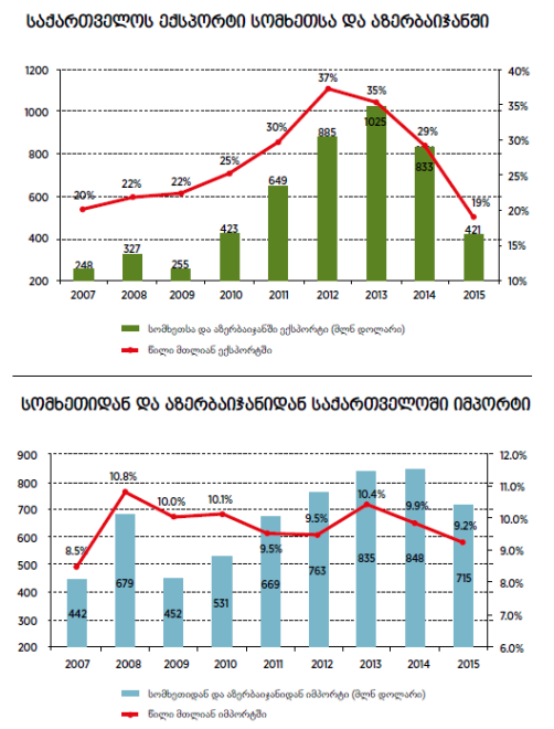 2015 წელს, 2014 წელთან შედარებით, საქართველოს ექსპორტი სომხეთსა და აზერბაიჯანში $412 მილიონით (49%-ით) შემცირდა და ჯამში, $421 მილიონი შეადგინა. თავდაპირველად, აზერბაიჯანში საქართველოს ექსპორტის შემცირებას მსუბუქი ავტომობილების შეყვანაზე გამკაცრებული რეგულაციები იწვევდა. თუმცა 2015 წლის ბოლოს სხვა პროდუქტების ექსპორტმაც კლება დაიწყო. უარყოფითი ეკონომიკური ტრენდისა და ორ მეზობელ ქვეყანაში ყარაბაღის კონფლიქტის ფონზე გაუარესებული ეკონომიკური მდგომარეობის გამო, 2016 წელს საქართველოს ექსპორტი აღნიშნული მიმართულებით ისევ შემცირდება. ეს ძირითადად აზერბაიჯანს ეხება, სადაც ჯერჯერობით საქართველოდან უფრო მეტი პროდუქცია გადის. დანაკარგი დამოკიდებულია ნავთობის ფასებსა და ყარაბაღის კონფლიქტის ესკალაციის დონეზე. საშუალო საფრთხის პირობებში, საქართველოს ექსპორტი სომხეთსა და აზერბაიჯანში დაახლოებით $200 მილიონით (50%-ით) შემცირდება. ამას ხელს უწყობს ისიც, რომ ლარი აზერბაიჯანულ მანათთან შედარებით, გამყარებულია. ეს ნიშნავს რომ აზერბაიჯანელებისთვის ქართული პროდუქცია ძვირდება.