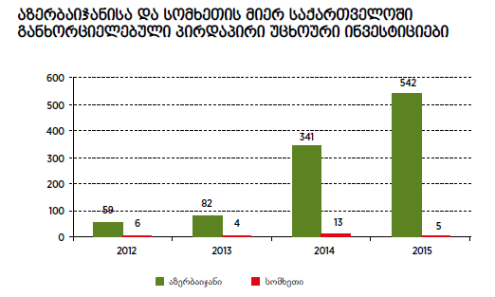 რაც შეეხება საქართველოს დამოკიდებულებას აზერბაიჯანულ და სომხურ ინვესტიციებზე, აქ ყურადღების გამახვილება მხოლოდ აზერბაიჯანზე ღირს. სომხეთიდან ინვესტიციების შემოსვლა მინიმალურია და მისი სრულად შეწყვეტაც კი ჩვენს ეკონომიკაზე მნიშვნელოვან გავლენას ვერ იქონიებს. 2015 წლის მონაცემებით საქართველოში ყველაზე მეტი პირდაპირი უცხოური ინვესტიცია – $542 მილიონი აზერბაიჯანიდან შემოვიდა. 2014 წელს $341 მილიონი შემოვიდა. 2015 წელს პირდაპირი ინვესტირებით აზერბაიჯანი საქართველოს ყველაზე დიდი ინვესტორი იყო. ასეთი სიდიდით ინვესტიციების შემოსვლა მნიშვნელოვანწილად ახალი გაზსადენის, შაჰ-დენიზ 2-ის განხორციელებას უკავშირდება. შესაბამისად, არ შეიძლება დავუშვათ, რომ რეგიონში სიმშვიდის პირობებშიც კი აზერბაიჯანიდან იმავე მოცულობის ინვესტირება შენარჩუნდება. 2016 წლიდან აზერბაიჯანიდან ინვესტირების კლება გარდაუვალია. ყარაბაღის კონფლიქტი ინვესტიციებს კიდევ უფრო შეამცირებს. რთულია იმის თქმა, თუ რა მოცულობა იქნება ეს დოლარებში. კლების პოტენციალი კი ცალსახად მაღალია.