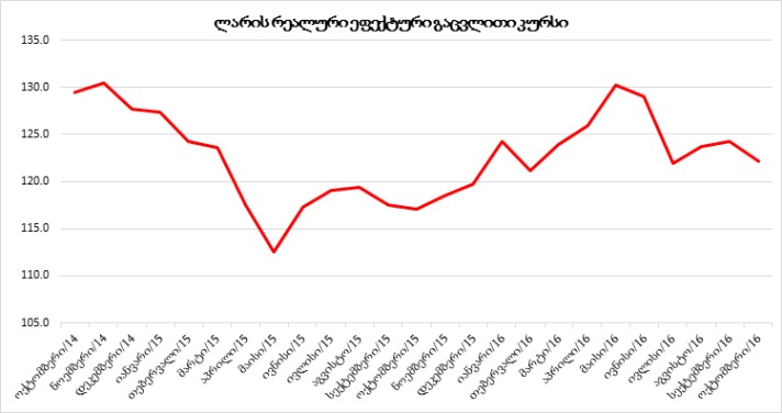 2016 წლის ოქტომბერში რეალური ეფექტური გაცვლითი კურსის ინდექსი 2 პუნქტით შემცირდა და 122.2 შეადგინა. ლარი გაუფასურდა დოლართან, ევროსთან და რუბლთან, ხოლო თურქულ ლირასთან მიმართებით გამყარდა.