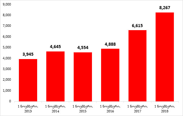 2017 წლის პირველ ნოემბერთან შედარებით, 2018 წლის პირველ ნოემბერს ლარში განთავსებული დეპოზიტები 1.65 მილიარდი ლარითაა გაზრდილი, ხოლო უცხოურ ვალუტაში დეპოზიტები 311 მლნ დოლარით.