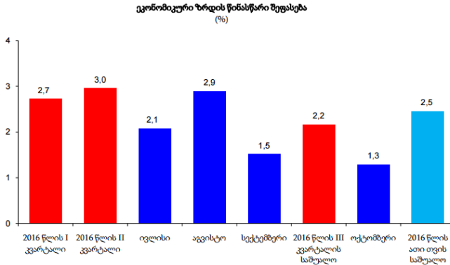 მიმდინარე წლის პირველ კვარტალში საქართველოს ეკონომიკა 2.6%-ით გაიზარდა, მეორე კვარტალში 3.0%-ით, მესამე კვარტალში კი 2.2%-ით. 2016 წლისთვის, ჯამში, საქართველოს მთავრობა 3%-იან ეკონომიკურ ზრდას პროგნოზირებს.