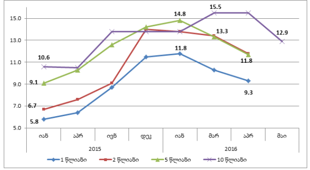მიუხედავად იმისა, რომ მიმდინარე წლის მარტიდან სახელმწიფო ფასიანი ქაღალდების საპროცენტო განაკვეთი იკლებს, გასული წლის მაისთან შედარებით 10 წლიანი ობლიგაციების წლიური საპროცენტო განაკვეთი 2.4% პუნქტით არის გაზრდილი.