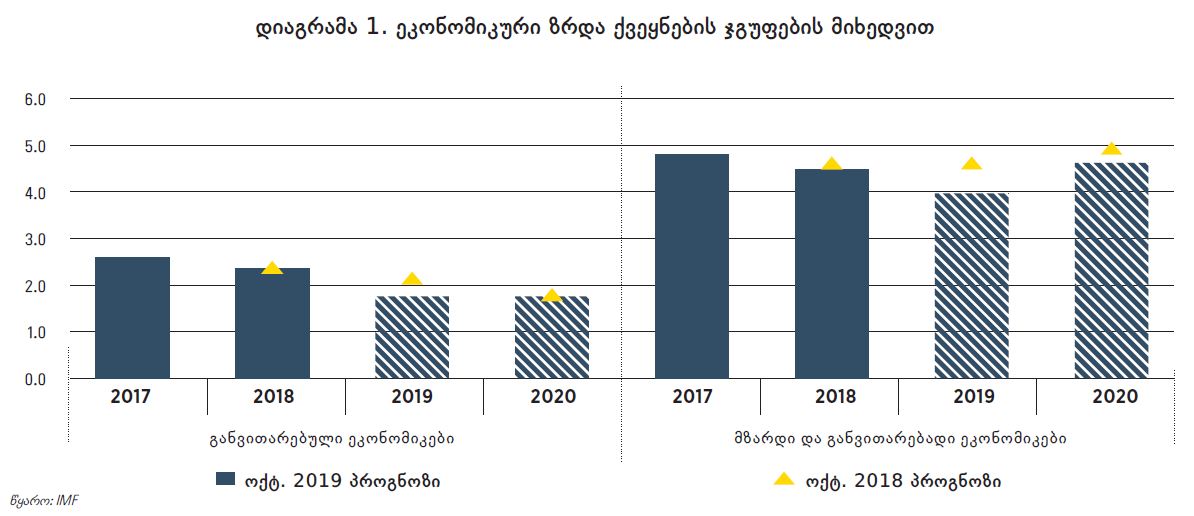 მართალია, გონივრული მაკროეკონომიკური პოლიტიკის გატარების კვალდაკვალ, ქვეყნის მოწყვლადობა საგარეო რისკების მიმართ მცირდება, თუმცა არსებული საგარეო რისკები გაზრდილია. კერძოდ, გლობალური ეკონომიკური ზრდის პროგნოზები ბოლო პერიოდში შემცირების მიმართულებით გადაიხედა. საერთაშორისო სავალუტო ფონდის პროგნოზის მიხედვით, გლობალური ეკონომიკა 2019 წელს 3, ხოლო 2020 წელს 3.4 პროცენტით გაიზრდება. ეკონომიკური ზრდის პროგნოზები შემცირებულია როგორც განვითარებული, ასევე მზარდი და განვითარებადი ეკონომიკის მქონე ქვეყნებისთვის (იხ. დიაგრამა 1).