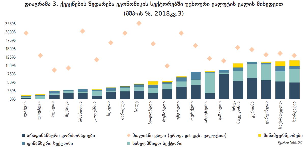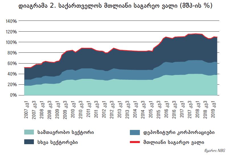 რისკის პრემიის შესაძლო ზრდა და სავალუტო რისკი ვალის მომსახურებისა და მისი მდგრადობის მთავარ გამოწვევებად რჩება. ბოლო წლებში საქართველოს მთლიანი საგარეო ვალის მშპ-თან თანაფარდობა სტაბილურია, თუმცა ეს მაჩვენებელი ისტორიულად მაღალ ნიშნულზე არის შენარჩუნებული (იხ. დიაგრამა 2). საქართველოს საგარეო ვალი ძირითადად უცხოური ვალუტითაა დენომინირებული და, შესაბამისად, მნიშვნელოვნად მოწყვლადია გაცვლითი კურსის მერყეობის მიმართ. აღნიშნული რისკი თვალსაჩინო გახდა 2014-2016 წლებში აშშ დოლარის გლობალური გამყარებისა და რეგიონში არასტაბილური მდგომარეობის ფონზე ადგილობრივი ვალუტის გაუფასურების დროს. მიუხედავად იმისა, რომ საქართველოს მთლიანი ვალის მაჩვენებელი სხვა მზარდ ეკონომიკებთან შედარებით გამოკვეთილად მაღალი არაა, უცხოურ ვალუტაში არსებული ვალდებულებების წილი თითქმის ყველა ტიპის მსესხებლისთვის ერთ-ერთი ყველაზე მაღალია შესადარ ქვეყნებთან მიმართებით (იხ. დიაგრამა 3). თუმცა უნდა აღინიშნოს, რომ საქართველოს საგარეო ვალის მნიშვნელოვანი ნაწილი საერთაშორისო ფინანსური ინსტიტუტებიდან კონცესიური (შეღავათიანი) პირობებითაა ნასესხები, რაც ამ ტიპის სესხებზე საბაზროსთან შედარებით მომსახურების დაბალ ტვირთს გულისხმობს.