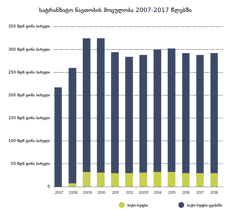 მაგალითად, ბათუმის პორტმა 2000 წელს 8 მილიონი ტონა ტვირთი მიიღო, საიდანაც 7 მლნ ტონა ნავთობს წარმოადგენდა. პორტის ვებგვერდზე გამოქვეყნებული სტატისტიკის მიხედვით, 2018 წლის განმავლობაში გადაზიდული 3.7 მილიონი ტონიდან ნავთობი მხოლოდ 1 მლნ-ს შეადგენდა.
