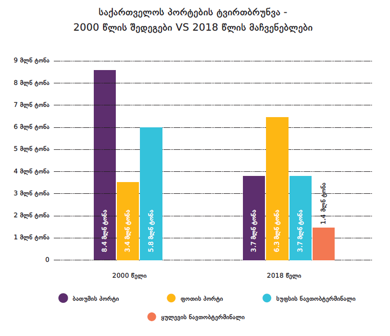 ტვირთების ეს მოცულობა 2000 წელს არსებულ 17.6 მილიონ ტონას 16%-ით ჩამოუვარდება. დღეს საქართველოს ყველაზე დატვირთულ პორტად ფოთის პორტი ითვლება, რომელმაც 2018 წელს 6.3 მილიონი ტონა ტვირთი გაატარა. 2000 წელს კი ყველაზე დიდი ტვირთბრუნვა ბათუმის პორტს ჰქონდა. ამ წელს ბათუმის გავლით 8.4 მილიონმა ტონა პროდუქტმა გაიარა.
