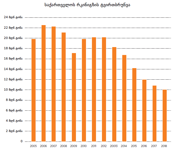ოფიციალური სტატისტიკის მიხედვით, გასული 6 წლის განმავლობაში საქართველოს რკინიგზის ტვირთბრუნვა 50%-ით დაეცა და 2018 წელს მხოლოდ 10 მილიონი ტონა შეადგინა. შედარებისთვის, 2003 წელს რკინიგზის მიერ გატარებული ტვირთების რაოდენობა 16.3 მლნ ტონა, 2005 წელს კი 20 მლნ ტონა იყო.