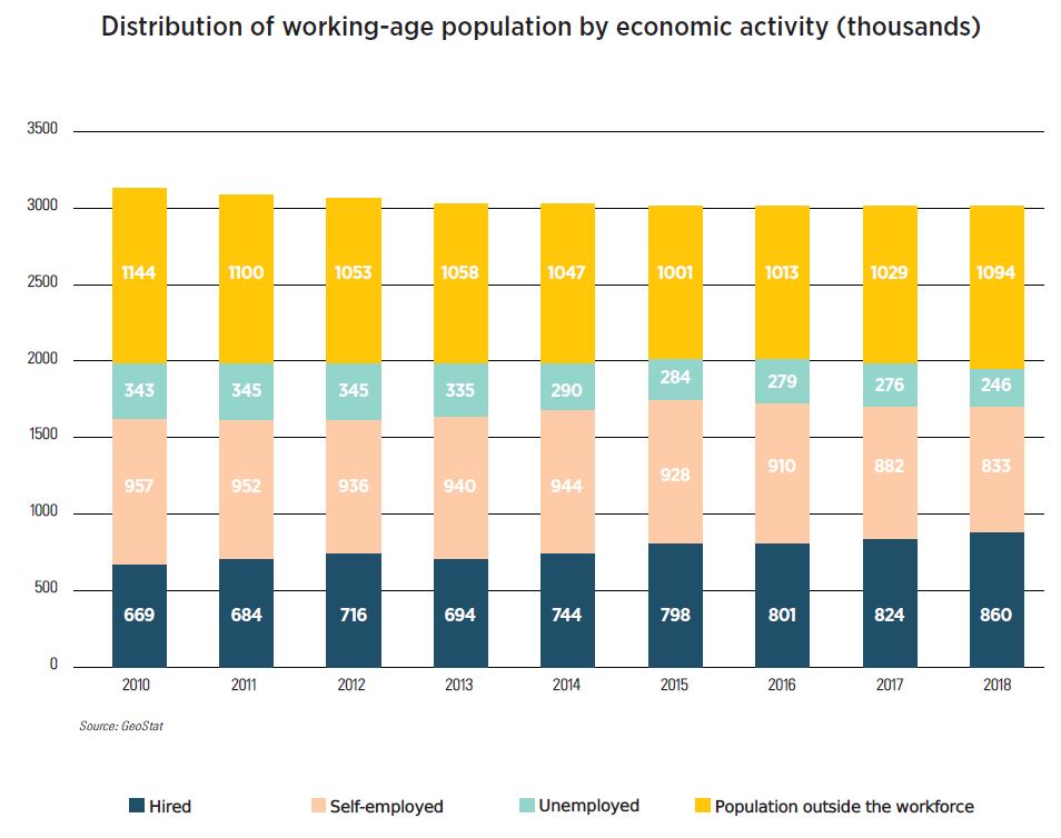 If we were to translate the official GeoStat statistics into an average Georgian person’s perception, we would conclude that there are approximately 1.5 million people looking for a job in this country. In 2014-2018, the number of people in work grew by an average of 33,000 per year, and therein lies the problem:at this rate, it would take 45 years to employ 1.5 million people.