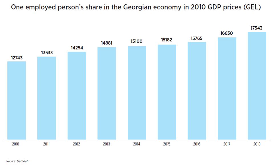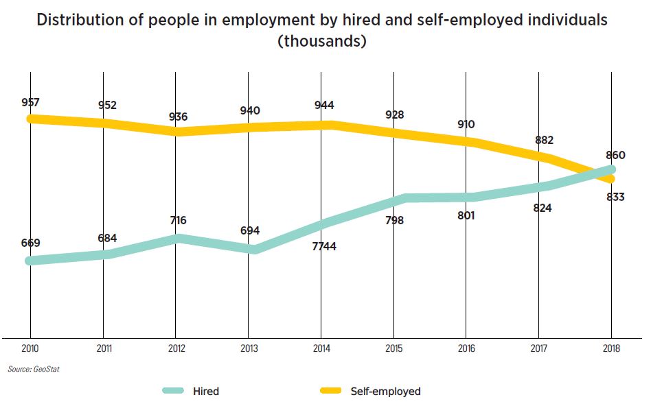 In terms of work productivity, the situation is as follows: in 2010, an employee created 12,700 GEL in added value for the Georgian economy, while in 2018 this figure grew to 17,500 GEL (not including the effect of inflation). This means that work productivity increased by 38%. Had it not increased at all, then the Georgian economy would have required 38% more employees in 2018 than in 2010; in reality, it only needed 4.1% more. Discounting the self-employed, we see that the number of hired employees increased by 29% during the same period, meaning that the new jobs required certain qualifications and knowledge, reducing demand for self-employed individuals.