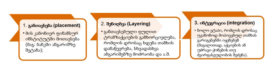 ფულის გათეთრების გზა და მეთოდები მრავალნაირია. ყველაზე ხშირად გათეთრების დროს უკანონო ფული გადის სამ ძირითად ეტაპს: