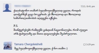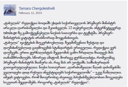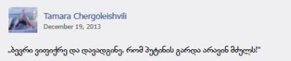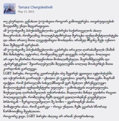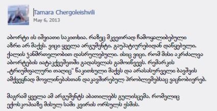 თამარ ჩერგოლეიშვილის პოსტი ფეისბუკზე 2013 წლის 17 მაისს: