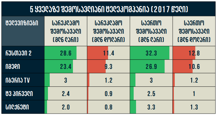 TI-ის მონაცემებით, სარეკლამო შემოსავლები 69.2 მლნ ლარამდე არის, რაც წინა წელს მიღებულ შემოსავალთან შედარებით დაახლოებით 14.1 მლნ ლარით ნაკლებია. შესაბამისად, 2017 წელს ლარში სარეკლამო შემოსავლები დაახლოებით 16.9%-ით შემცირდა.