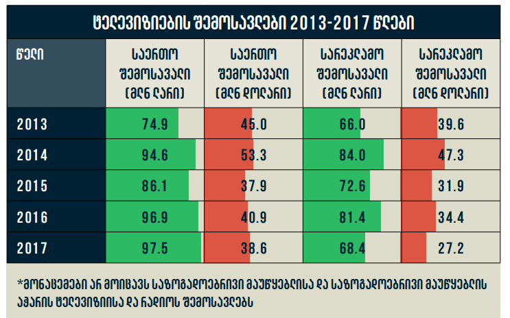 2017 წელს წინა წელთან შედარებით ტელეკომპანიების საერთო შემოსავალი მცირედით, 0.6 მლნ ლარით გაიზარდა და ჯამში 97.5 მლნ ლარი შეადგინა.