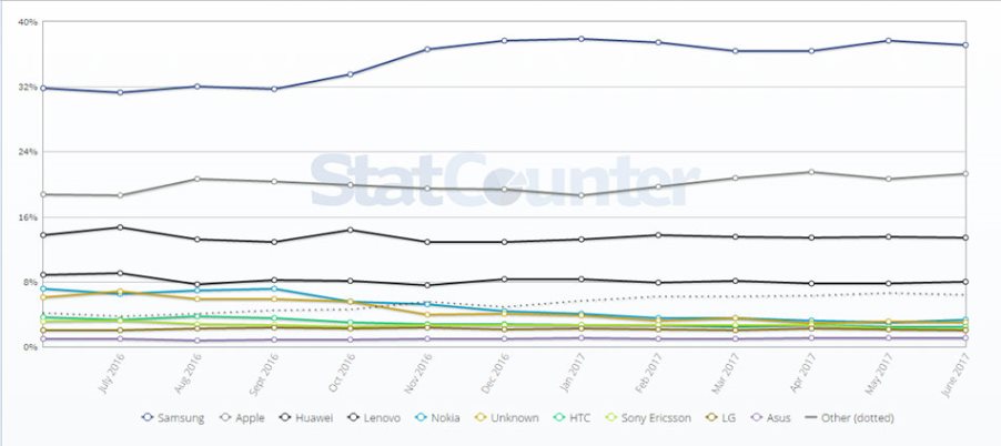 მსოფლიოში გაყიდული მობილური მოწყობილობების ყველაზე დიდი წილი Samsung-ს უჭირავს. ეს მაჩვენებელი ივნისის ბოლოს 33,1% იყო და წინა წელთან შედარებით, თითქმის 0,5%-ით გაზრდილია. მეორე ადგილზე კი მსოფლიოში Apple-ია ბაზრის 19,3%-ით; 4,48% უჭირავს Huawei-ს, ხოლო LG-ს 3,6%.
