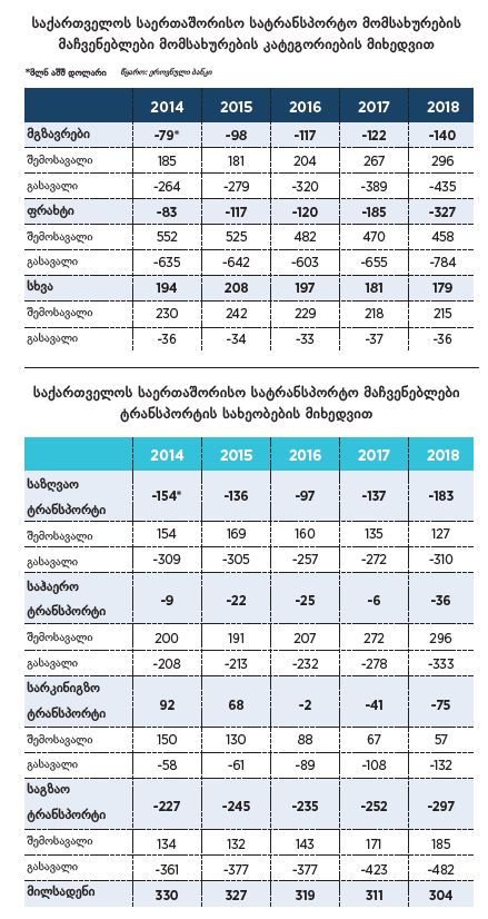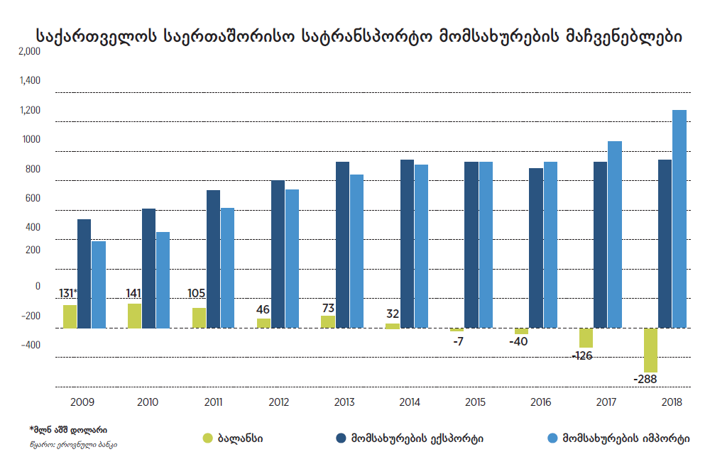 მონაცემების ანალიზი ცხადყოფს, რომ საქართველოს ეკონომიკის, ტვირთბრუნვისა და ტურიზმის ზრდის პარალელურად საერთაშორისო სატრანსპორტო მომსახურების უარყოფითი ბალანსი იზრდება, მაშინ როცა მაღალი პოტენციალი გვაქვს, სატრანსპორტო მომსახურებით ქვეყნის შემოსავლები იზრდებოდეს. ყველაზე მაღალი დეფიციტი ტვირთის გადატანის მომსახურებაში გვაქვს – 327 მლნ დოლარი. საერთაშორისო ტვირთების ძირითადი მიმღები და გამგზავნი საზღვაო პორტებია. 2018 წელს ცალკე აღებული საზღვაო ფრახტის უარყოფითი ბალანსი 306 მლნ დოლარი იყო. ეს აშკარად მიანიშნებს, თუ რამდენად მნიშვნელოვანია საქართველოს პორტების განვითარება და მათ შორის, ანაკლიის ღრმაწყლოვანი პორტის მშენებლობა, რომელიც უკვე დაწყებულია და პრობლემების წინაშე დგას. ასევე გამოიკვეთა სარკინიგზო ტრანსპორტით საერთაშორისო მომსახურების შედეგების გაუარესება: 2015 წელს თუ 68 მლნ დოლარის დადებითი ბალანსი გვქონდა, 2018 წელი უკვე 75 მლნ დოლარის უარყოფითი ბალანსით დავასრულეთ.