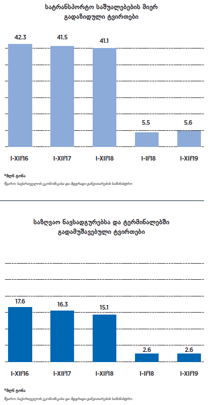 სამინისტროს ინფორმაციით, 2018 წელს 41.1 მლნ ტონა ტვირთი გადაიზიდა საქართველოში, რაც 2016-2017 წლების მაჩვენებლებზე ნაკლებია. 2019 წლის იანვარ-თებერვალში 5.6 მლნ ტონა ტვირთი გადაიზიდა, რაც 2018 წლის იანვარ-თებერვლის მაჩვენებელზე 0.1 მლნ ტონით მეტია.