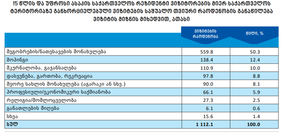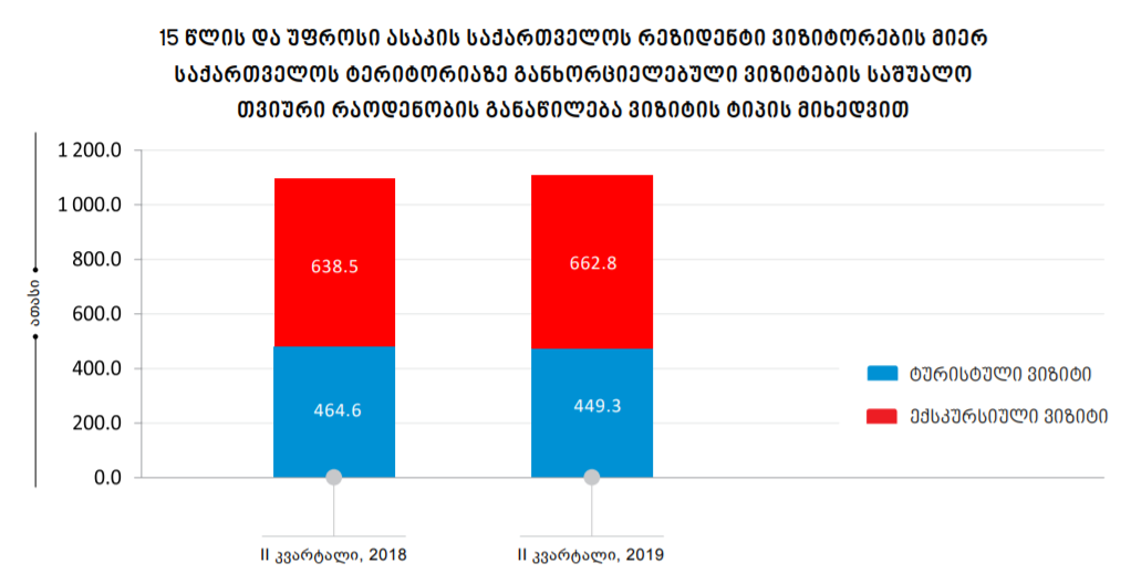 სტატისტიკის სამსახურის მონაცემებით, 2019 წლის მეორე კვარტალში საქართველოს რეზიდენტი ვიზიტორების მიერ საქართველოს ტერიტორიაზე განხორციელებული ტურისტული ტიპის ვიზიტების საშუალო თვიური რაოდენობა 449.3 ათასით განისაზღვრა, რაც 3.3 პროცენტით ნაკლებია წინა წლის შესაბამისი პერიოდის მაჩვენებელთან შედარებით.