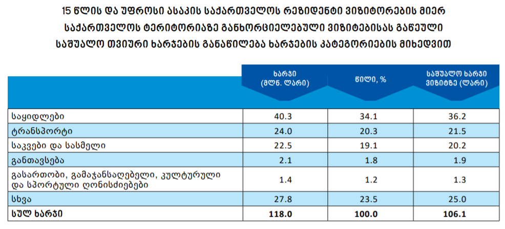 2019 წლის მეორე კვარტალში განხორციელებული ვიზიტებისას გაწეული საშუალო თვიური ხარჯების მოცულობა განისაზღვრა 118.0 მილიონი ლარით. აღნიშნული მაჩვენებელი 9.7 პროცენტით ნაკლებია გასული წლის შესაბამისი პერიოდის მაჩვენებელთან შედარებით. ამასთან, ვიზიტზე გაწეული საშუალო ხარჯი შემცირებულია 12.4 ლარით და 106.1 ლარს უტოლდება.