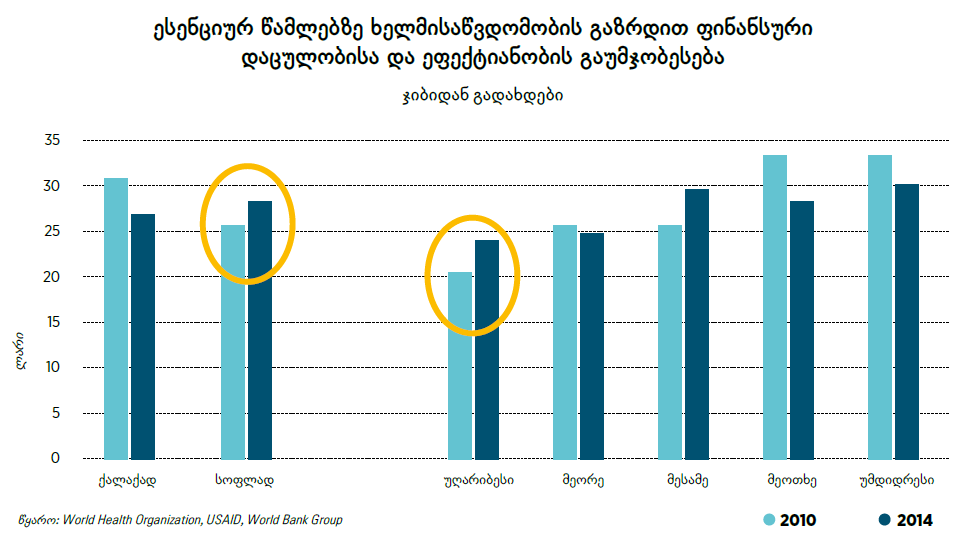 მსოფლიო ბანკის მიერ 2017 წლის ივნისში გამოქვეყნებულ “საქართველოს საჯარო ფინანსების მიმოხილვაში”, რომელიც ჯანდაცვის სექტორზე აქცენტით ჩატარდა, პირდაპირაა ნათქვამი, რომ “ჯანდაცვაზე სახელმწიფო დანახარჯების ზრდის მიუხედავად, ჯიბიდან გადახდები ჯანდაცვის დაფინანსების კვლავ დომინანტურ წყაროდ რჩება (მთლიანი ხარჯის 66%)”.