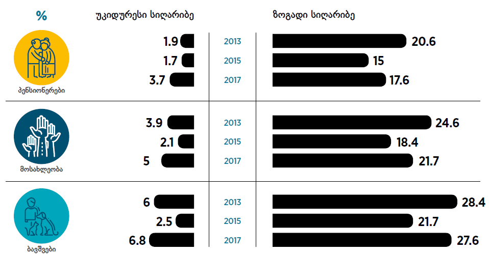 2015 წელთან შედარებით, 2017 წელს ზოგადი სიღარიბის ზღვარს ქვემოთ მცხოვრები მოსახლეობის, ბავშვებისა და პენსიონერების რიცხვი, შესაბამისად, 3.3, 5.9 და 2.6 პროცენტული პუნქტით გაიზარდა (ზოგადი სიღარიბის ზღვრად მიჩნეულია 2.5 აშშ დოლარი დღეში, რაც ერთ ეკვივალენტურ ზრდასრულ პირზე თვეში 188 ლარს შეესაბამება).