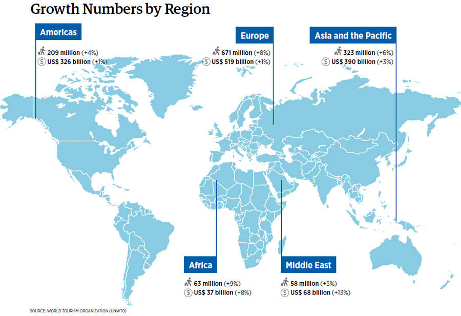 The two regions with the largest growth were Africa, with 9%, and Europe, with 8%. What’s stunning about those numbers, though, is that Europe received over half the world’s international tourism arrivals, 671 million, while Africa received less than a tenth of that amount, just 63 million.