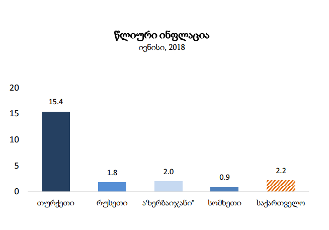 ივნისში რეგიონის ქვეყნებში, გარდა თურქეთისა, სამომხმარებლო ფასების ინფლაცია მსგავსი დინამიკით ხასიათდება. კერძოდ, 2018 წლის ივნისში თურქეთში წლიურმა ინფლაციამ 15.4% შეადგინა. შედარებით დაბალი იყო ინფლაციის დონე რუსეთსა (1.8%) და სომხეთში (0.9%). რაც შეეხება აზერბაიჯანს, 2018 წლის მაისის მდგომარეობით, სამომხმარებლო ფასებმა წინა წლის ანალოგიურ პერიოდთან შედარებით 2.0%-ით მოიმატა.