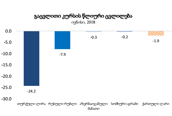 ივნისში რეგიონის ქვეყნების ვალუტების გაცვლითი კურსები აშშ დოლართან მიმართებაში გაუფასურების ტენდენციას ავლენს, თუმცა სრულიად განსხვავებული ზომით. კერძოდ, 2018 წლის ივნისში, წინა წლის შესაბამის პერიოდთან შედარებით, აშშ დოლართან მიმართებაში ყველაზე მკვეთრად გაუფასურდა თურქული ლირა (24.2%-ით) და რუსული რუბლი (7.9%-ით), შედარებით ნაკლებად – აზერბაიჯანული მანათი (0.3%-ით) და სომხური დრამი (0.2%-ით).