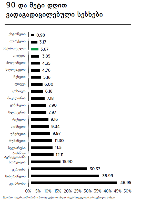 2016 წლისთვის ვადაგადაცილებული სესხების მაჩვენებელი 3.67 პროცენტს შეადგენდა, რაც საერთაშორისო სავალუტო ფონდის მონაცემებით, უკეთესი მაჩვენებელია, ვიდრე ლატვიაში, უნგრეთში, ლიტვაში, ჩეხეთში და ა.შ.