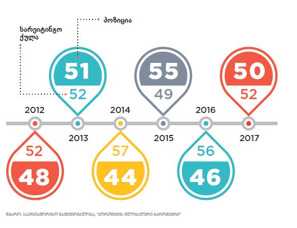 დავიწყოთ “საერთაშორისო გამჭვირვალობის” კვლევით. ამ უკანასკნელში, ბოლო მონაცემებით, საქართველო 180 ქვეყანას შორის 46-ე ადგილს იკავებს. კორუფციის აღქმის ინდექსი ემყარება ექსპერტების შეფასებებსა და მოსაზრებებს საჯარო სექტორში კორუფციის დონის შესახებ. კვლევაში ფასდება სასამართლო ხელისუფლების ეფექტიანობა, გამოძიებებთან დაკავშირებული პრობლემები და თანამდებობის პირებთან დაკავშირებული შესაძლო კორუფციული ფაქტები. რეიტინგში 100 ქულა კორუფციის აღქმის ყველაზე დაბალ, ხოლო 0 ქულა – ყველაზე მაღალ დონეს აღნიშნავს.