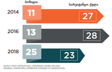 Trace International-ის კორუფციის აღქმის რისკის ბოლო მონაცემების მიხედვით კი საქართველო მსოფლიოს 200 ქვეყანას შორის 25-ე ადგილზეა. ზემოთ ნახსენები კვლევებისგან მას ის გამოარჩევს, რომ რეიტინგი სპეციალურად ბიზნესისა და ინვესტორებისთვის დგება. რაც უფრო დაბალია ქვეყნის სარეიტინგო ქულა, მით უფრო დაბალია ბიზნესის რისკები. წინა წლებთან შედარებით, საქართველო რეიტინგში ჩამოქვეითდა (კვლევაში მოხვედრილი ქვეყნების რაოდენობის ზრდის გამო), თუმცა რისკების შეფასებისას გამოყენებულ კრიტერიუმებში ქვეყნის პოზიცია გაუმჯობესებულია.