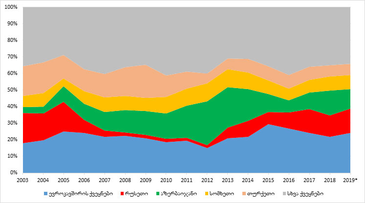 ქვეყნების მიხედვით საქართველოს ექსპორტში ყველაზე მაღალი წილი რუსეთს აქვს. 2019 წლის პირველ ნახევარში (იანვარ-ივნისში) რუსეთის წილი 14.7%-ია. თუ ევროკავშირის ბაზარს განვიხილავთ როგორც ერთ ქვეყანას, რადგან ევროკავშირის ქვეყნებს საერთო ბაზარი აქვთ, მაშინ საქართველოს ექსპორტში ყველაზე მაღალი წილი ევროკავშირს უჭირავს – 24%. საქართველოს ექსპორტში 12% უჭირავს აზერბაიჯანს, რაც ძირითადად მსუბუქი ავტომობილების რეექსპორტითაა განპირობებული.