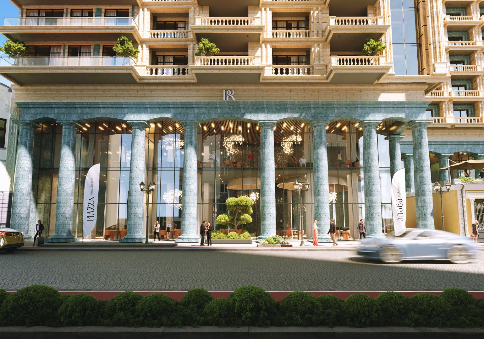არქიტექტურულად დომინანტი, ბუნებრივი ქვით შეფუთული 13-მეტრიანი კოლონადების, ვინტაჟური ესთეტიკით შთაგონებული ექსტერიერისა და მინიმალისტური, თანამედროვე ინტერიერის ერთობლიობით, Piazza Residence-ი კიდევ უფრო უნიკალური და შთამბეჭდავი ხდება.