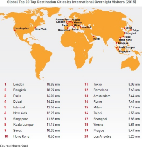 კომპანია MasterCard-ი ყოველწლიურად აწარმოებს კვლევას (Global Destinations Cities Index), თუ რომელ ქალაქებს სტუმრობს ყველაზე მეტი უცხოუელი ტურისტი. კვლევა 132 დიდ ქალაქს მოიცავს. 2015 წლის მონაცემებით, ყველაზე მეტი, 18.8 მილიონი ტურისტი ინგლისის დედაქალაქს – ლონდონს ესტუმრა. მეორე ადგილზეა ტაილანდის დედაქალაქი – ბანგკოკი 18.2 მილიონი ტურისტით. 2012-2013 წლებში ბანგკოკი ლონდონსაც უსწრებდა. მესამეზე კი პარიზია 16 მილიონი ტურისტით.