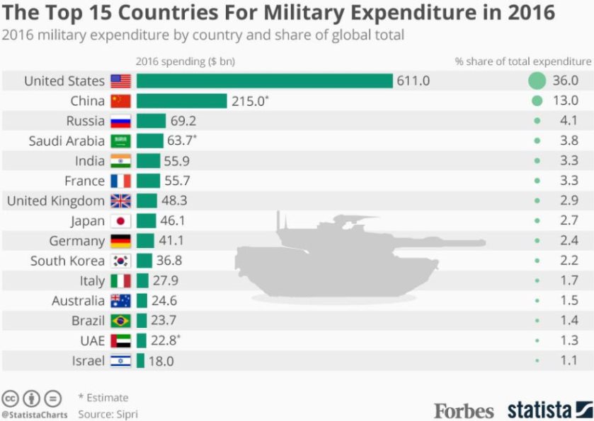 სტოკჰოლმის საერთაშორისო მშვიდობის კვლევითი ინსტიტუტის მონაცემებით 2016 წელს მსოფლიოში სამხედრო ხარჯებმა 1.7 ტრილიონი დოლარი შეადგინა, მსოფლიოს ეკონომიკის 2.2%. აქედან ამერიკის შეერთებული შტატების მიერ გაწეულ ხარჯზე მოდის 611 მილიარდი დოლარი, მსოფლიო სამხედრო ხარჯების 36%. აშშ-მა უფრო მეტი დახარჯა, ვიდრე ერთად აღებულმა ჩინეთმა, რუსეთმა, საუდის არაბეთმა, ინდოეთმა, საფრანგეთმა, ბრიტანეთმა, იაპონიამ და გერმანიამ.