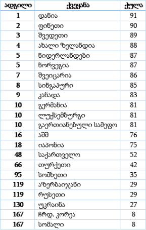 რეიტინგის ბოლო ადგილს (167-ე) ინაწილებენ ჩრდილოეთ კორეა და სომალი, მათ თანაბრად 8-8 ქულა აქვთ.