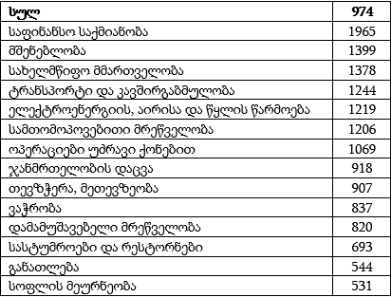 2016 წლის მეორე კვარტალში ყველაზე მაღალი საშუალო ხელფასი დაფიქსირდა საფინანსო სექტორში – 1965 ლარი. მეორე ადგილზეა მშენებლობა – 1399 ლარით, ხოლო მესამეზე სახელმწიფო მმართველობაა – 1378 ლარით. ყველაზე დაბალი ხელფასი კი სოფლის მეურნეობაშია – თვეში 531 ლარი, შემდეგ მოდის განათლების სფერო – თვეში საშუალოდ 544 ლარი. 2015 წლის მეორე კვარტალთან შედარებით, საშუალო თვიური ხელფასი ყველაზე მეტად ელექტროენერგიის, აირისა და წყლის წარმოება-განაწილებაში გაიზარდა – 144 ლარით, 71 ლარით შემცირდა უძრავი ქონებით ოპერაციებში დასაქმებულთა ხელფასი.