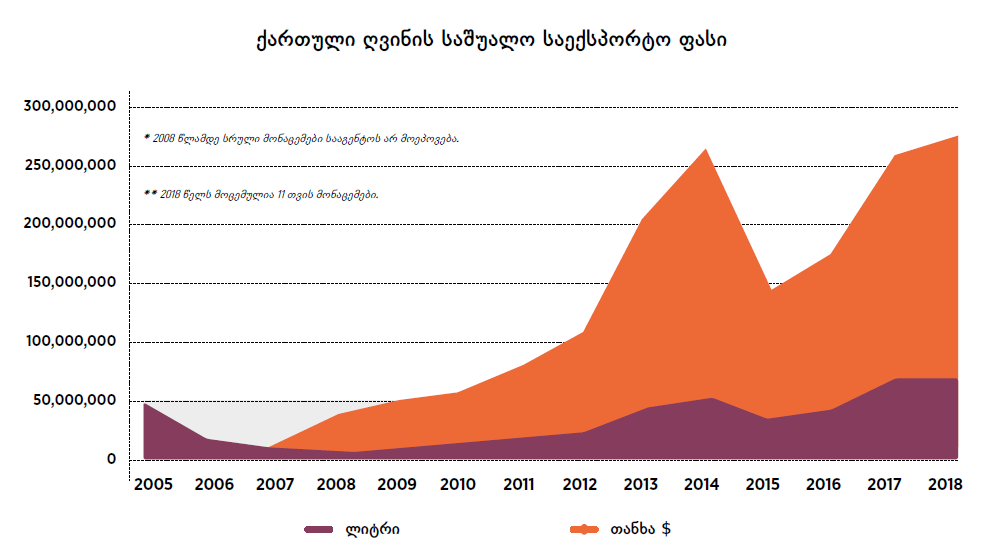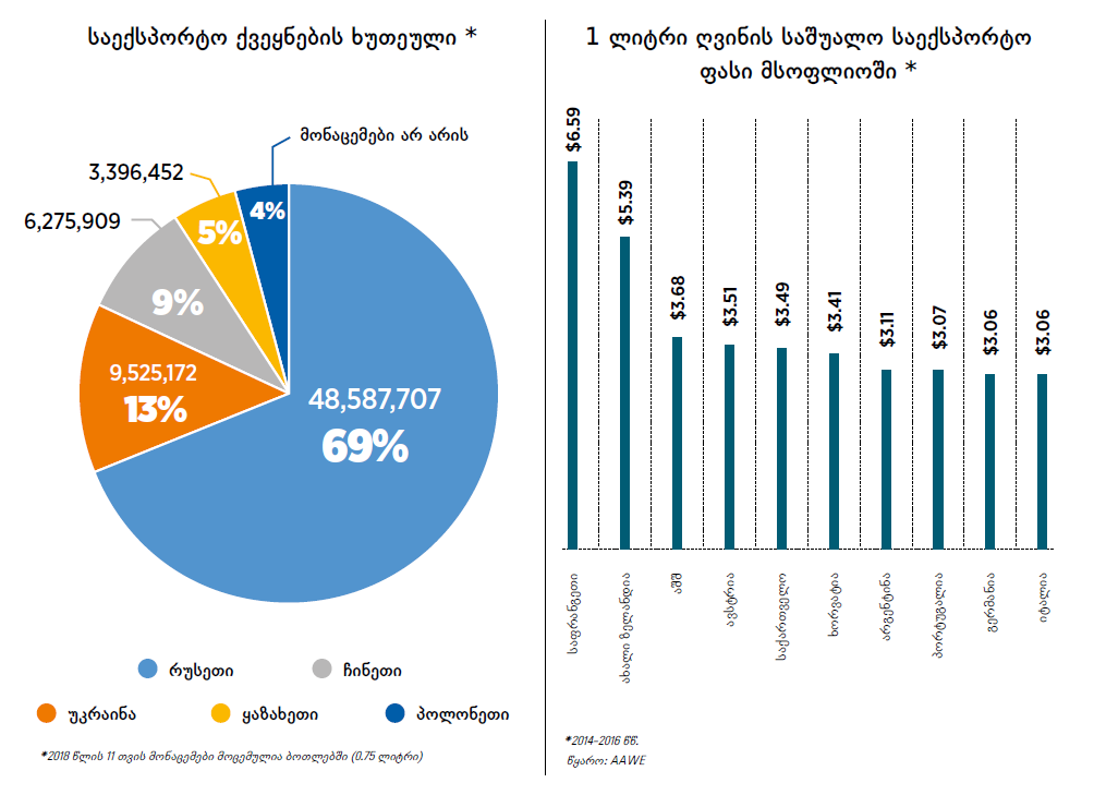 American Association Of Wine Economists-ის (AAWE) ინფორმაციის მიხედვით, 2014-2016 წლებში ექსპორტზე გატანილი 1 ლიტრი ღვინის საშუალო ღირებულებით საქართველო მსოფლიოში მე-5 ადგილს იკავებს. “ღვინის ეკონომისტების ამერიკული ასოციაცია” პრესტიჟული ამერიკული ორგანიზაციაა და მის მიერ შედგენილი რეიტინგით პირველ ადგილს საფრანგეთი იკავებს. ღვინის საექსპორტო საშუალო ფასი განსხვავდება საექსპორტო ბაზრების მიხედვითაც და ყველა ქვეყანაში ერთსა და იმავე ნიშნულზე არ არის. AAWE-ს მონაცემებისგან მცირედით განსხვავდება ღვინის ეროვნული სააგენტოს მონაცემები. რაოდენობრივად ქართული ღვინისთვის რეკორდული წელი 2017 იყო, თუმცა ექსპორტისგან მიღებულმა შემოსავალმა მაქსიმალურ ნიშნულს 2014 წელს – რუსული ემბარგოს მოხსნიდან ერთ წელიწადში მიაღწია. 2006 წლის ემბარგომდე ქართული ღვინისთვის მთავარი საექსპორტო ბაზარი მხოლოდ რუსეთი იყო, ემბარგოს შემდეგ კი მწარმოებლებმა ბაზრების დივერსიფიკაცია დაიწყეს.