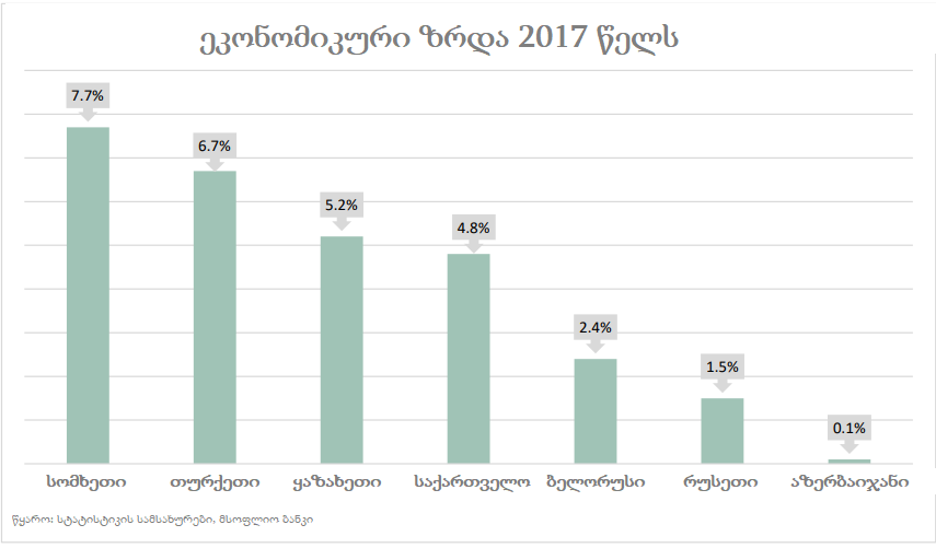 რეგიონის ქვეყნებიდან, გასულ წელს ერთ-ერთი შთამბეჭდავი იყო სომხეთის ეკონომიკის ზრდა – 7.7%. შედარებისთვის, 2016 წელს სომხეთის ეკონომიკა მხოლოდ 0.2%-ით გაიზარდა.