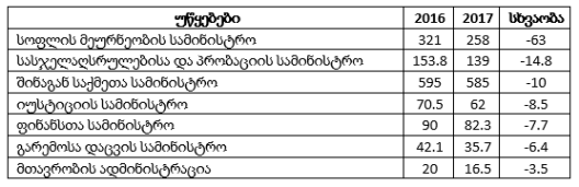2017 წლის სახელმწიფო ბიუჯეტის პროექტის მიხედვით, 2016 წელთან შედარებით, ყველაზე მეტად სოფლის მეურნეობის სამინისტროს ბიუჯეტი მცირდება – 63 მლნ ლარით. სოფლის მეურნეობის სამინისტროს ბიუჯეტის კლებას ძირითადად შემდეგი პროგრამების დაფინანსების შემცირება განაპირობებს: მცირემიწიან ფერმერთა საგაზაფხულო სამუშაოების ხელშეწყობის ღონისძიებები აღარ დაფინანსდება, რომელიც წელს 48 მლნ ლარით დაფინანსდა, თანხა არ არის გამოყოფილი ყურძნის და ციტრუსის სუბსიდირებაზეც, 13 მლნ ლარით მცირდება სამელიორაციო სისტემების მოდერნიზაციის და აგროსექტორის განვითარების ხელშეწყობის პროგრამის დაფინანსება,